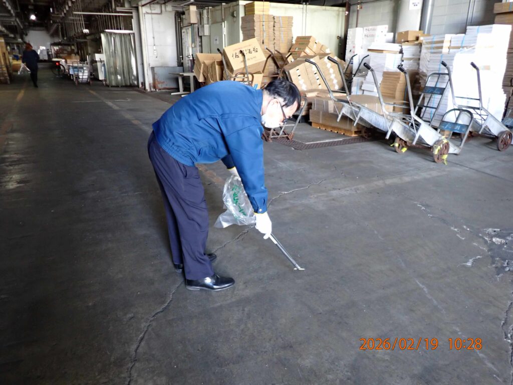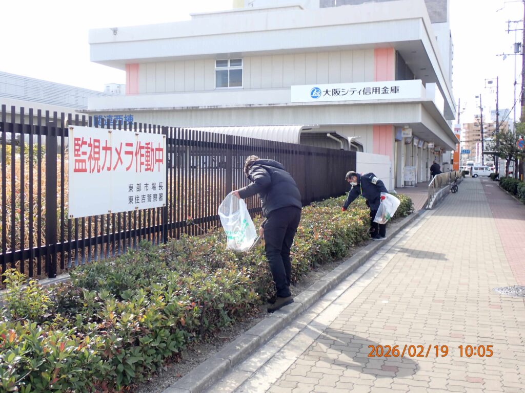 2月19日(木)の「場内一斉清掃」(衛生組合主催)は、通常の一斉清掃に加えて大阪市環境局からの呼びかけに応じ、大阪マラソン“クリーンUP”作戦に参加しました。この作戦は、「大阪マラソン」にあわせて来阪される皆さまをきれいなまち大阪で迎えられるよう大阪市全域で実施されており、東部市場も毎年参加しています。当日の参加者は48名でした。皆さんお疲れさまでした。
