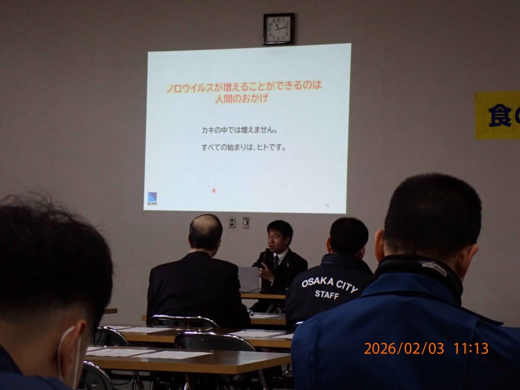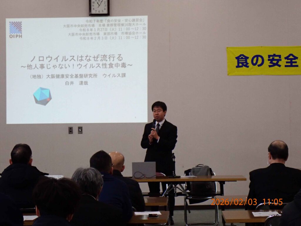 今回は、ノロウイルスによる食中毒が冬にピークを迎えることから、地方独立行政法人大阪健康安全基盤研究所ウイルス課の白井達哉氏を講師にお招きし「ノロウイルスはなぜ流行る~他人事じゃない!ウイルス性食中毒~」をテーマに講演していただきました。